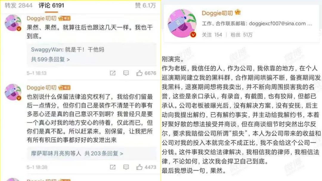 但市场过热,厂牌与艺人分成、规划方面等矛盾也在说唱歌手之间上演。例如《说唱新世代》出身的说唱歌手Doggie,就与前厂牌神奇脑电波因分成、工作问题闹出解约风波,如今已签约黄子韬旗下公司龙韬娱乐。此外,说唱歌手身份和生存境况的转变,也令不少说唱歌手进入了舒适圈,个人负面频出的同时,创作断档也引发了吃老本或是抄袭争议,再难有佳作。