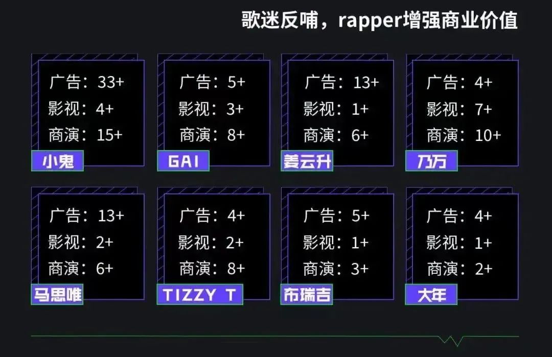 除此之外,说唱文化进入大众视野后,潮流文化、品牌代言、消费领域带来一定的商业倾斜,说唱歌手的商业价值迅速放大。