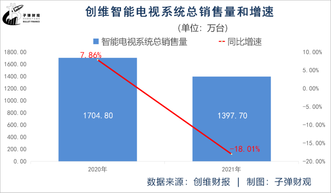 此外,创维的智能电视系统总销售量增速还呈逐年放缓的势头。财报显示,最近两个年度,创维的智能电视系统总销售量增速分别为7.86%和-18.01%。