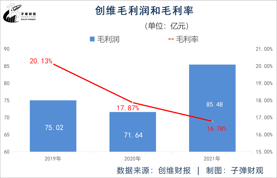 而成本的激增,带来的直接结果是创维毛利率的下滑。根据财报,在过去的3个年度里,创维的毛利率呈逐年递减的趋势,依次为20.13%、17.87%和16.78%。