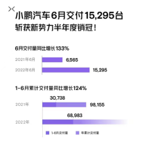 小鹏汽车6月交付15295辆,前6月累积交付68983辆,同比增长124%,成为半年交付最多的新势力车企。