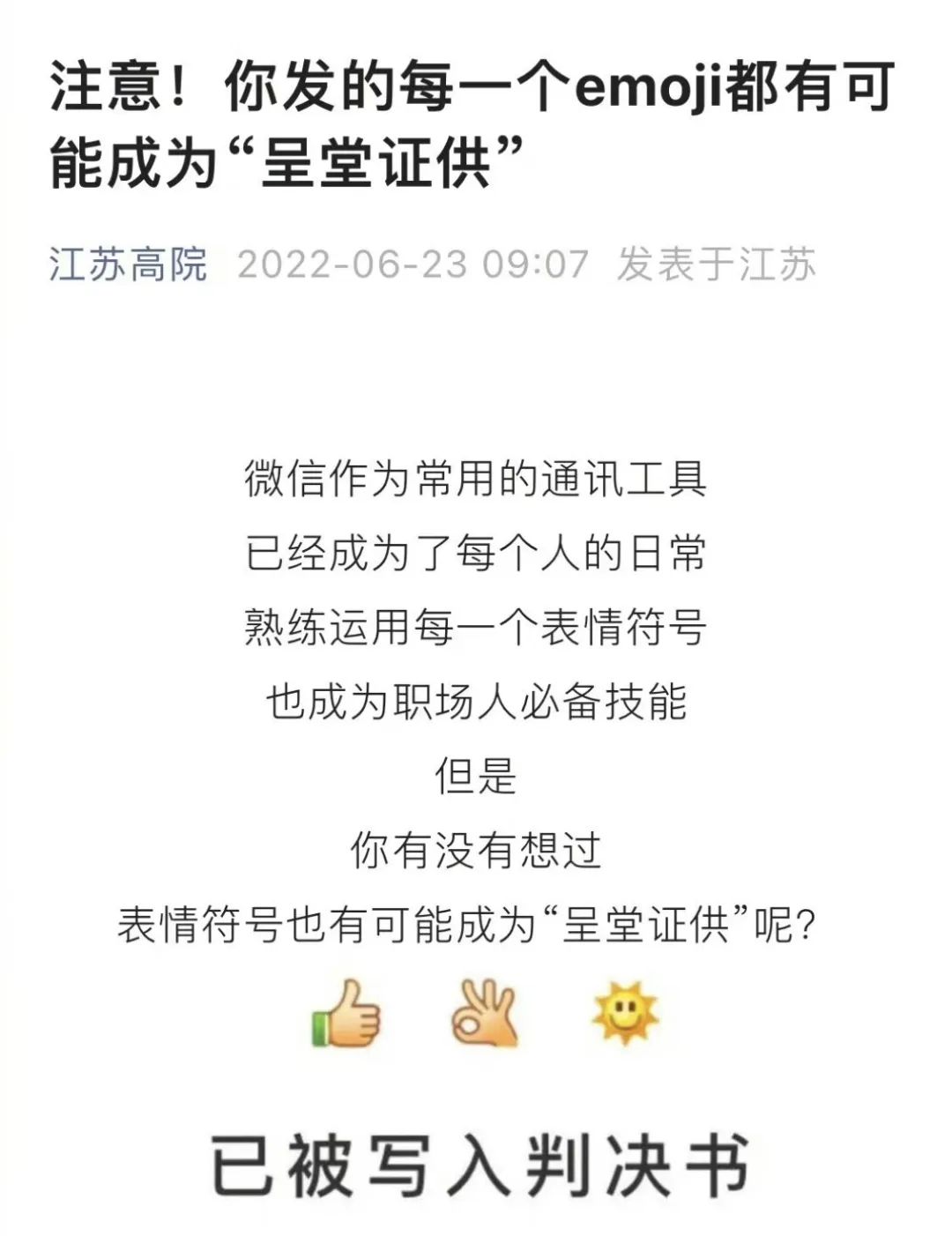 近日,江苏高院公众号发布的一篇名为《注意!你发的每一个emoji都有可能成为“呈堂证供”》的科普文在互联网上广泛传播,随之还引发网友对于微信表情符号使用的讨论。