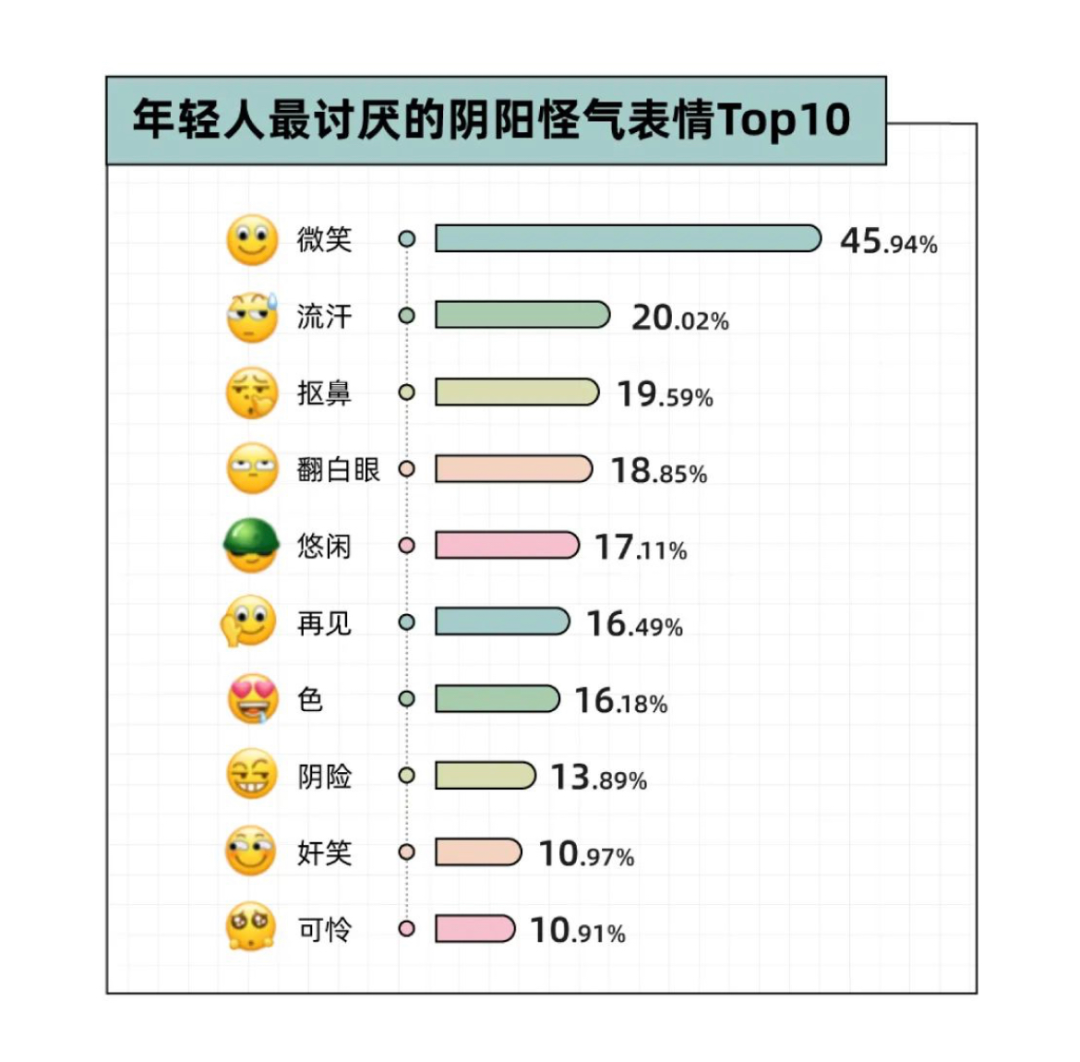 在情绪表达的本职功能之外,微信表情符号在发展过程中还衍生出身份区别的重要属性。例如典型的“黄脸微笑”,被认作是区别父辈与当下年轻一代的重要表情。在父母辈的理解中,这个表情就是其本意“微笑”,但后来在年轻一代网友的解读中,这个表情则有了假笑、尬笑等诸多含义。36氪旗下年轻态公众号“后浪研究所”发布的《2022年轻人微信情商报告》一文中就分析发现“微笑”是当代年轻人最讨厌的阴阳怪气表情第一。