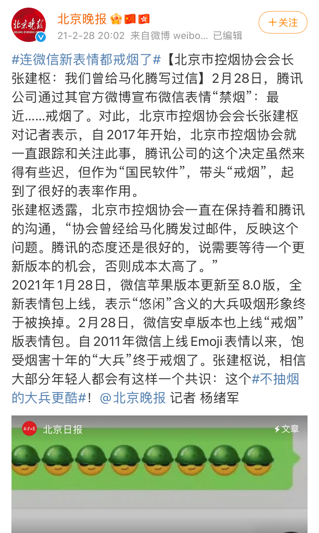 对于微信平台而言,未来应该加强表情符号方面的审核。在设计之初,就需要考虑表情符号存在的舆论争议,推出之后也要时刻监控,监测网友对某一表情的使用是否出现不当偏向。例如之前微信中“大兵抽烟”的表情,之后在各方提醒下最后调整为“戒烟版大兵”。