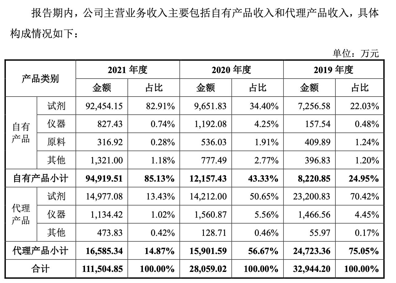 准确来说,中翰生物更像一家体外诊断代理商,主要销售Boditech的产品。2019年,公司的收入十分依赖代理产品,2020年占比下降至56.67%,而2021年若扣除新冠检测产品收入,代理产品在主营业务收入的比重仍在50%以上。