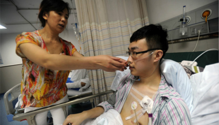 2016年7月27日,重庆大坪医院,胸部插着管子的重庆力帆球迷罗先生躺在病床上休息,等待手术。7月24日,重庆力帆对石家庄永昌一战,近5万名球迷冒着高温酷暑,以排山倒海的气势给主队助威,最终球队赢得比赛。只是,看台上出现了一个小插曲,比赛第6分钟力帆进球后,其中一名忠实球迷欢呼助威用力过猛,最终这哥们把肺“吼破”了。
