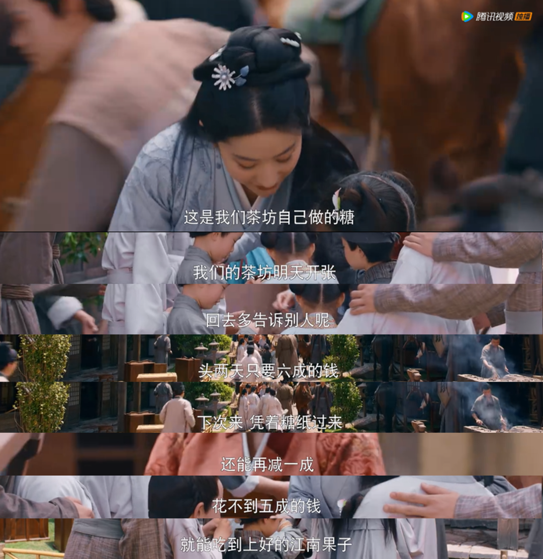 为了让茶坊开张那天爆火,赵盼儿在前一天预热,用自家做的糖果让一群小孩做地推,配合话术“头两天六折、凭糖纸再减一折”。广撒网式的宣传,给茶坊带来了大量曝光和新客。