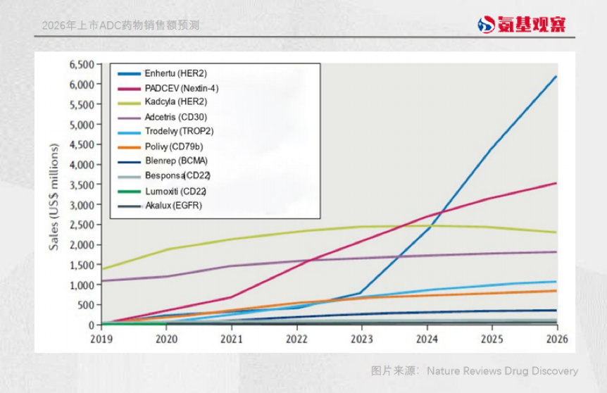 2021年《Nature Reviews Drug Discovery》发布的一篇文章更是预测,到2026年全球已上市ADC药物的市场规模将超过164亿美元,折合人民币近1100亿元。
