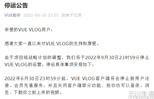 如今,尽管许多人都已经开始习惯于用视频来记录生活,但 VUE 却在日前发布停运公告,宣布将于 2022 年 9 月 30 日 23 时 59 分停止运营、关闭服务器。