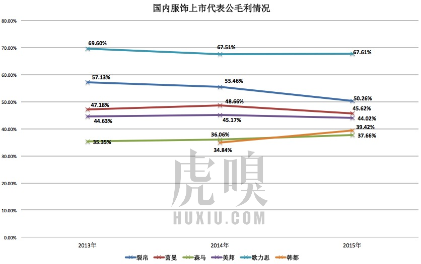 服饰类目的毛利要比标品中的3C家电更为可观,前者行业平均毛利水平能在50%左右。虎嗅选取了另外三家传统服饰上市公司,森马、美邦、歌力思进行比较: