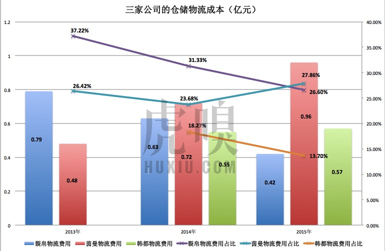 三家公司都是采用代工、柔性供应链,因此物流配送成本要远高于仓储成本。由于裂帛自己建仓,而茵曼、韩都都是外包给第三方,所以在营业额远低于后两者的情况下,裂帛物流仓储成本却逼近裂帛、韩都。