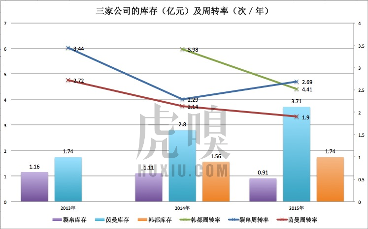 传统服饰品牌最大风险来自库存,清仓甩卖对品牌的损害极大。而电商服饰品牌采用柔性供应链,一定程度上降低了库存风险,但备货是必要的,特别是打造“爆款”。对比三家公司,茵曼在库存周转率及库存风险程度方面,都要远高于韩都、裂帛。