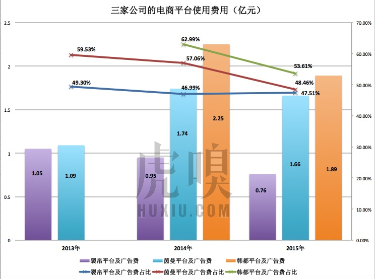 平台及广告费(包涵活动促销、平台佣金及技术服务费)占比超过销售费用的50%,在三家公司里属于非常正常的现象(电商渠道费用主要来自天猫、京东、唯品会),其中韩都最高,2014年达到了62.99%。大家所知道的所有电商公司玩“潜规则”涮单,其成本也包涵在平台及广告费。