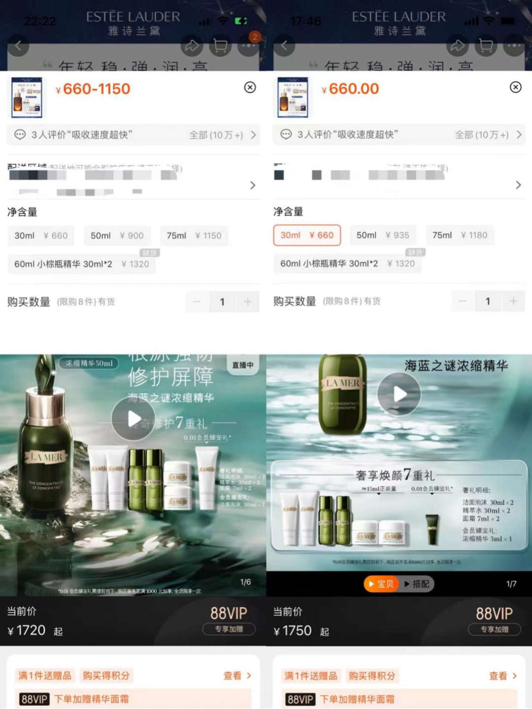 以雅诗兰黛为例,其明星产品小棕瓶精华,30ml规格未提价,50ml与75ml分别由原来的900元、1150元涨至935元、1180元。海蓝之谜100ml精粹水由原来的900元涨至930元,15ml精华露由原来的1720元涨至1750元。