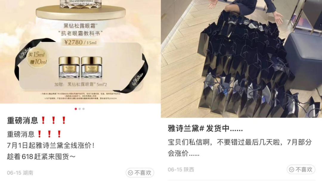 在618之前,大牌涨价的消息就在各社交平台传开,紧随其后的是促销信息,青眼在小红书上看到,多个自称雅诗兰黛柜姐的博主,在618前几日就发布笔记,放出7月1日即将调价的消息,并随即号召“趁着618”赶紧来囤货。