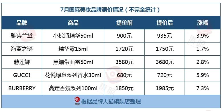 而今日,青眼对比多个品牌天猫旗舰店商品价格,发现雅诗兰黛、海蓝之谜、赫莲娜、GUCCI美妆、Burberry美妆的价格已然上涨。