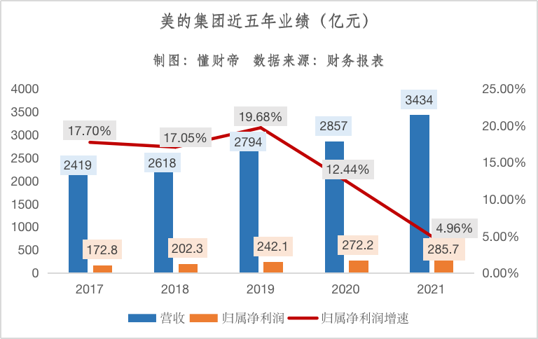 2021年,受地产红利消耗殆尽、居民消费意愿减弱等多重因素影响,美的营收为3434亿元,同比增长20.18%,归属净利润为285.7亿元,仅同比增长4.96%,为2013年以来的最低值。
