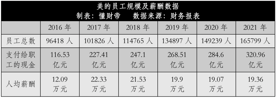 据公开资料,2017年,美的完成对工业机器人公司德国库卡的收购后,公司当年支付给职工的现金支出便飙升至224.41亿元,较2016年增长了近一倍。