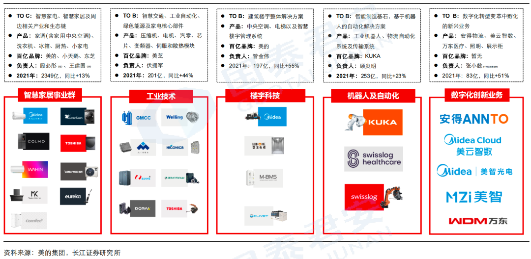 美的2021年报显示,截至目前,公司已组建工业技术、楼宇科技、机器人与自动化及数字化创新四大ToB业务板块。