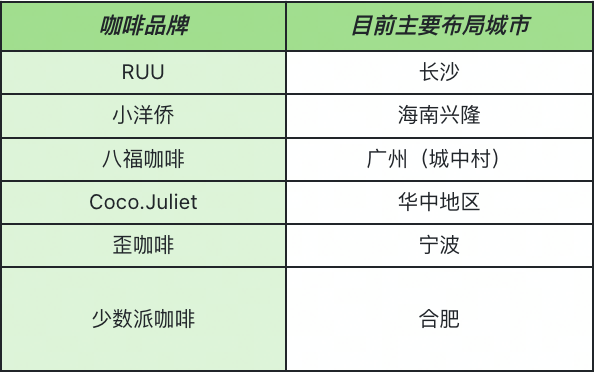 区域品牌方面,柠季全资控股的「RUU」和书亦烧仙草投资的「DOC」均来自长沙。5月获得融资的「八福咖啡」和「小洋侨」,分别是来自广州和海南的咖啡品牌,前者两家店均落在广州的城中村,后者称在海南兴隆、重庆、北京、张家口等地开设了线下店。