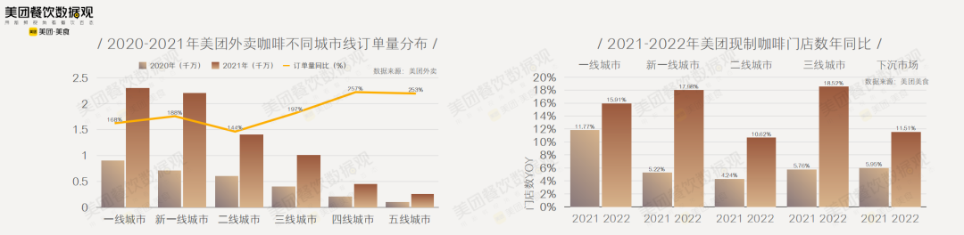 美团美食发布的《2022中国现制咖啡品类发展报告》显示,新一线和三线城市的咖啡门店数量增速最高,近19%。外卖数据显示,三四五线城市的咖啡订单量同比增长200%以上。