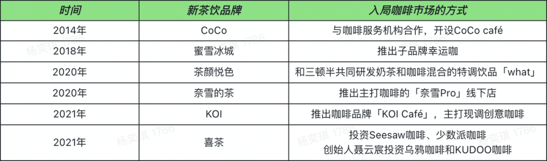 这也就解释了,为什么蜜雪冰城、奈雪、喜茶等新茶饮品牌陆续通过设立子品牌、投资等形式进入咖啡市场。