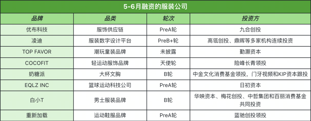 在过去的两个月中,一共有7家服饰公司拿到融资,除了「优布科技」和「凌迪」两家供应链公司,其余均为不同细分品类的服装品牌。