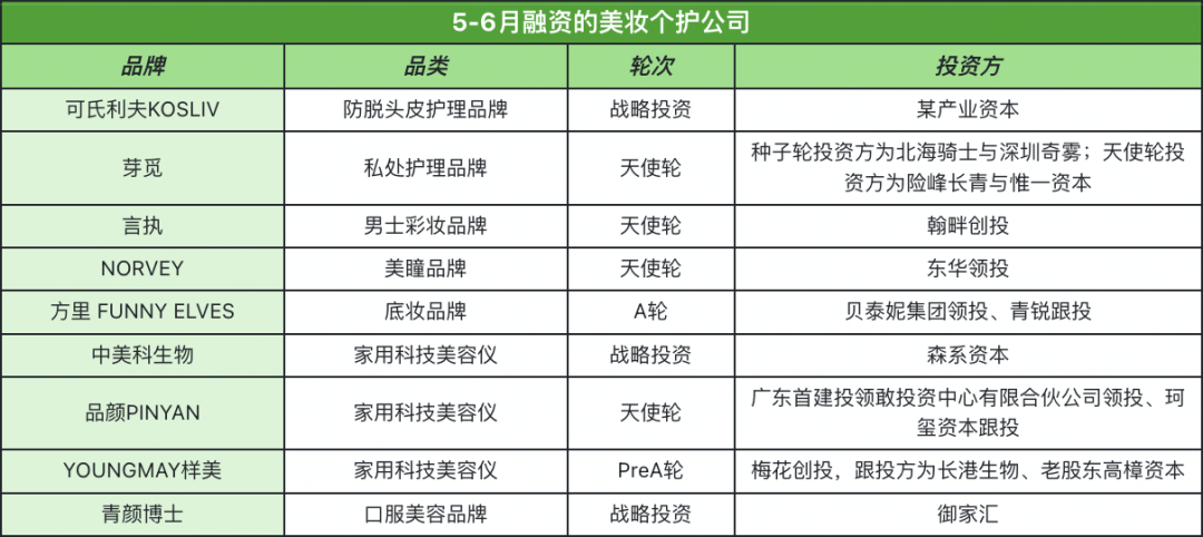 在彩妆、护肤、洗护这几个大品类的投资窗口关闭后,资本在大化妆品赛道的投资开始往更细分的方向走。比如,「可氏利夫」和「芽觅」聚焦的是局部个护——防脱头皮护理和私处护理;彩妆品类则是男士彩妆品牌「言执」、美瞳品牌「NORWEY」和底妆品牌「方里FUNNY ELVES」拿到融资。