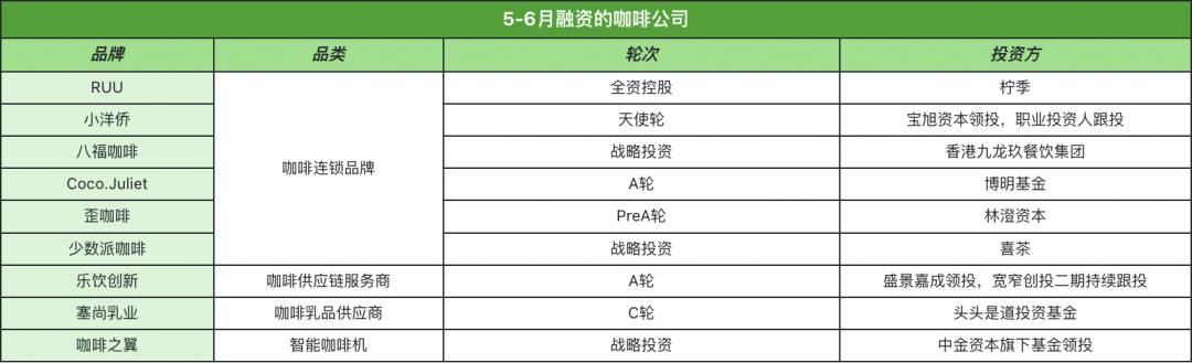引起我们关注的是咖啡行业,在过去的两个月一共有6家咖啡公司宣布获得融资,除了「乐饮创新」和「塞尚乳业」两家供应链公司,其余均为咖啡连锁零售品牌。