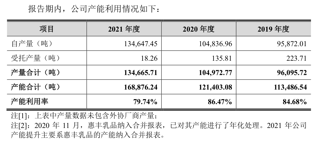 根据说明书,2020年,菊乐股份完成了一笔收购,收购了惠丰乳品(2020年11月惠丰乳品纳入合并报表),也弥补了公司在东北区域、华东区域等地的销售渠道。也即是说,公司通过收购,强化了在全国性市场的拓展。同时也使得菊乐股份产能数据得到了提升,2021年的产能合计16.89万吨,全年产能利用率79.74%,2020年的产能为12.14万吨,产能利用率数据为86.47%。菊乐股份持有惠丰乳品55%的股份。