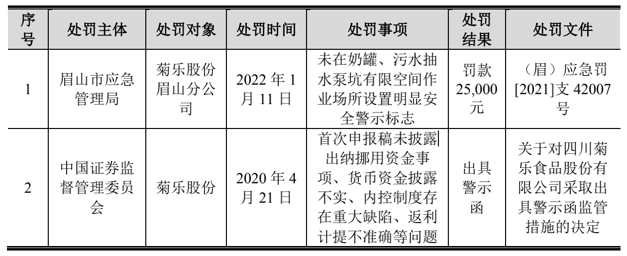 另外,在2022年1月11日,眉山市应急管理局还出具了《行政处罚决定书》,认定菊乐股份眉山分公司未在奶罐、污水抽水泵坑有限空间作业场所设置明显安全警示标志,违反了《工贸企业有限空间作业安全管理与监督暂行规定》,决定给予2.5万元的行政处罚。