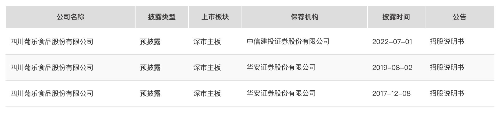 四川菊乐食品股份有限公司(下称“菊乐股份”)对四川人来说,还是很熟悉的,不过该公司几番IPO都无功而返。2022年7月1日新受理的名单中,该公司再次出现,和之前保荐机构系华安证券不一样,这一次换成了中信建投证券,这与再度IPO的周六福一样。