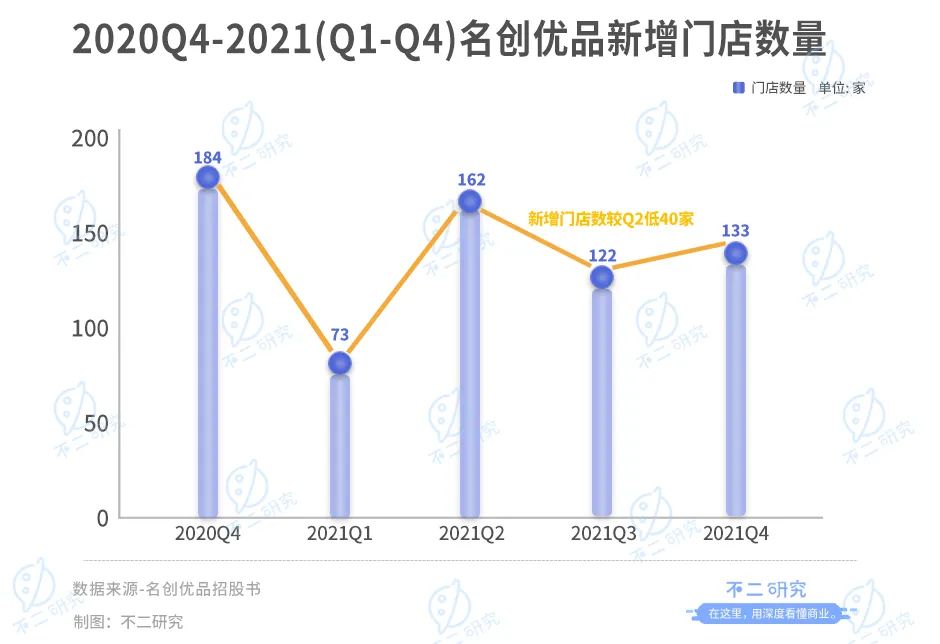 从开店速度看,2021年QI-Q4季度名创优品分别新增门店73家,162家,122家,133家,均低于2020年第四季度单季度新增的184家,且2021年Q3的单季度新增门店数比第二季度低40家,国内外门店增速同步放缓。