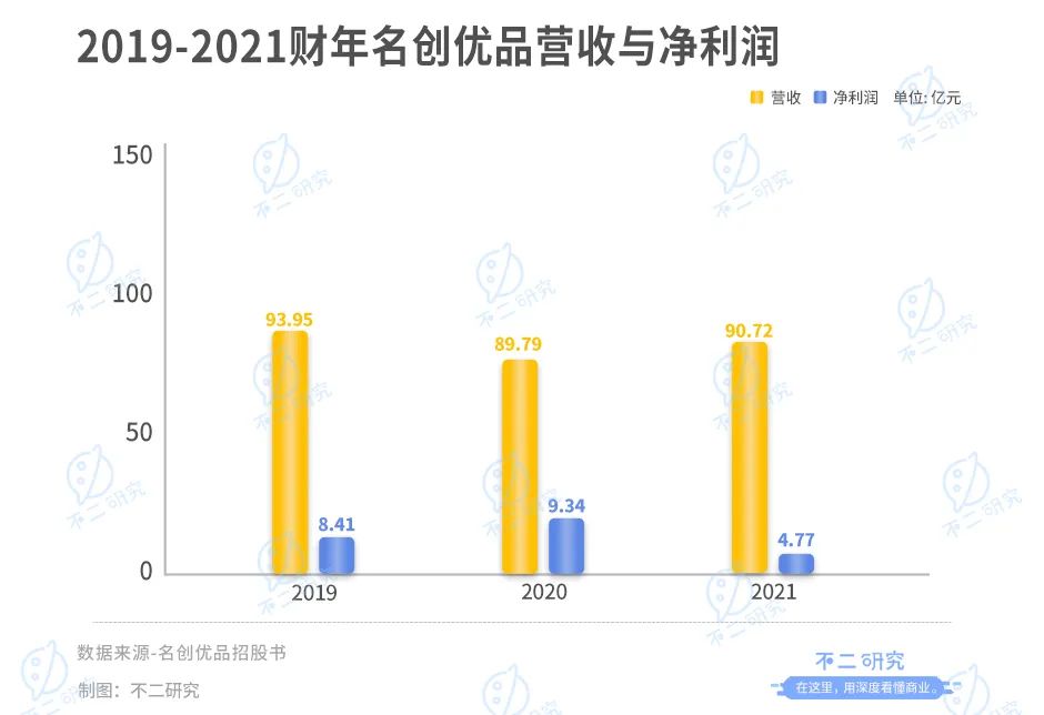 「不二研究」据其招股书发现,名创优品在2021年的营收为90.72亿元,同比增加1.03%;经调整后的净利为4.80亿元,同比减少50.55%。