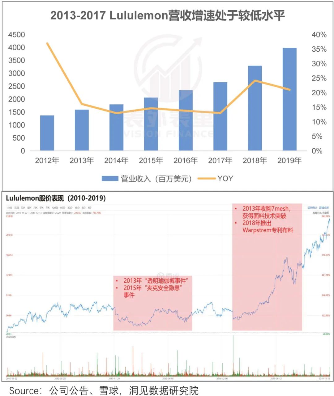 如下图,2013-2015年Lululemon出现质量危机时,业绩、股价双坍塌;2017年面料革新后,业绩、股价再次起飞。