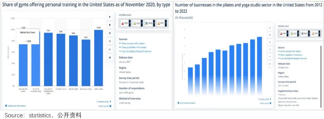 据statistics数据,2019年之后,美国瑜伽房的数量大幅增加。到2020年,疫情催化瑜伽运动进一步加速渗透,美国健身房开设瑜伽课占比达83%,全美的瑜伽渗透率达57%。