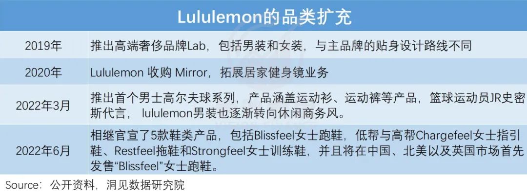 一般来说,主产品出现瓶颈,简单粗暴的解决办法就是扩品类,耐克、阿迪达斯等都是这么过来。Lululemon做的也是同样的尝试。
