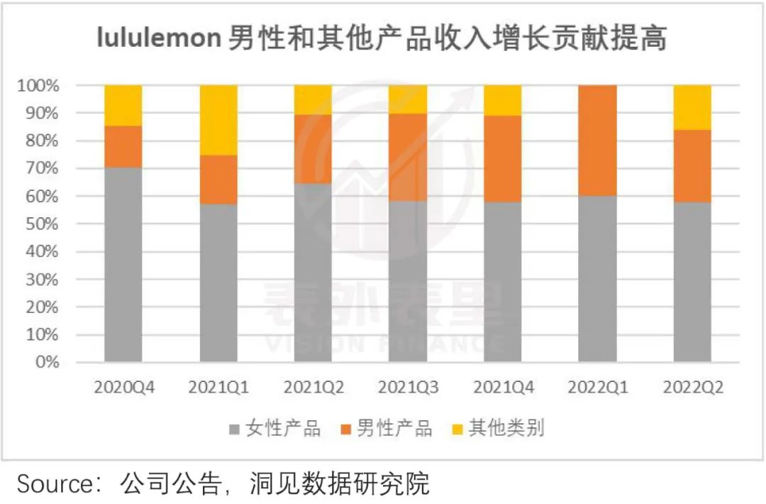 而其信心,或许来自已扩品类的不错反馈。比如其男性产品品类,2021Q1-2022Q1,对Lululemon的收入增长贡献持续提升。