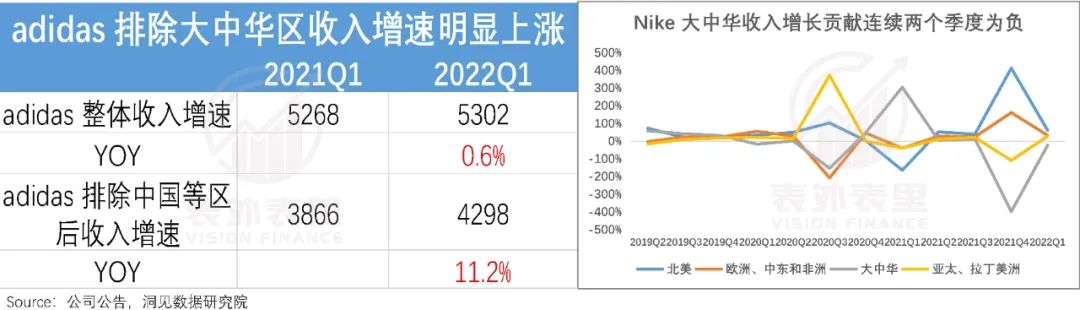 如下图,阿迪达斯2022Q1整体收入增速为0.6%,排除大中华区后增速可达11%;耐克更是连续三个季度,大中华区负增长。