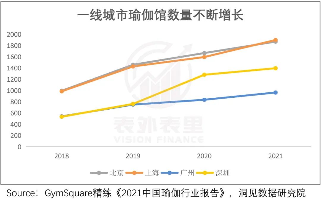 数据显示,2021年中国瑜伽场馆规模达到42350家,相比2020年增长9.1%。其中,多个一线城市的瑜伽馆数量都呈明显增长。
