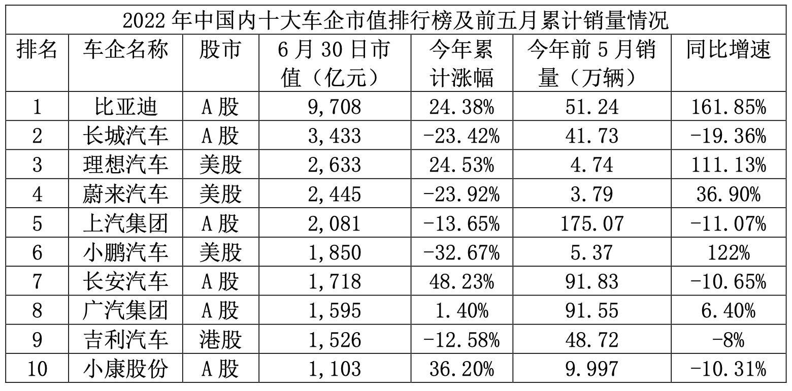 据6月30日数据显示,2022年中十大车企市值排行榜中,比亚迪以市值9708亿元夺得头筹,市值超过排行榜第二至四名总和。长城汽车和小康股份累计涨幅尤为明显,小鹏汽车的同比增速仅次于第一名比亚迪。