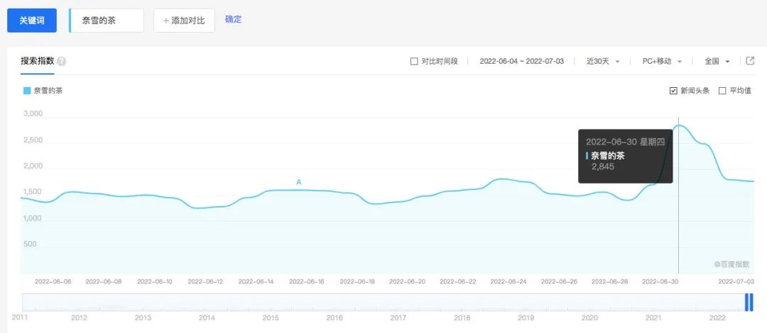 根据百度指数,6月30日当天,奈雪的茶搜索指数达到了2830,相较于前一天增长了66%。热度维持到了7月1日。在微博、小红书等社交媒体上,奈雪的茶也被用户热议。