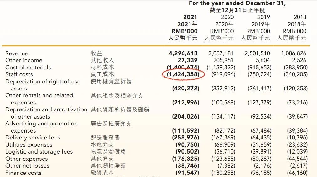 收入增长抵消不了扩张带来的经营成本上涨压力。材料成本同比增长20.6%,员工成本同比增长30%,而租金成本直接翻倍。