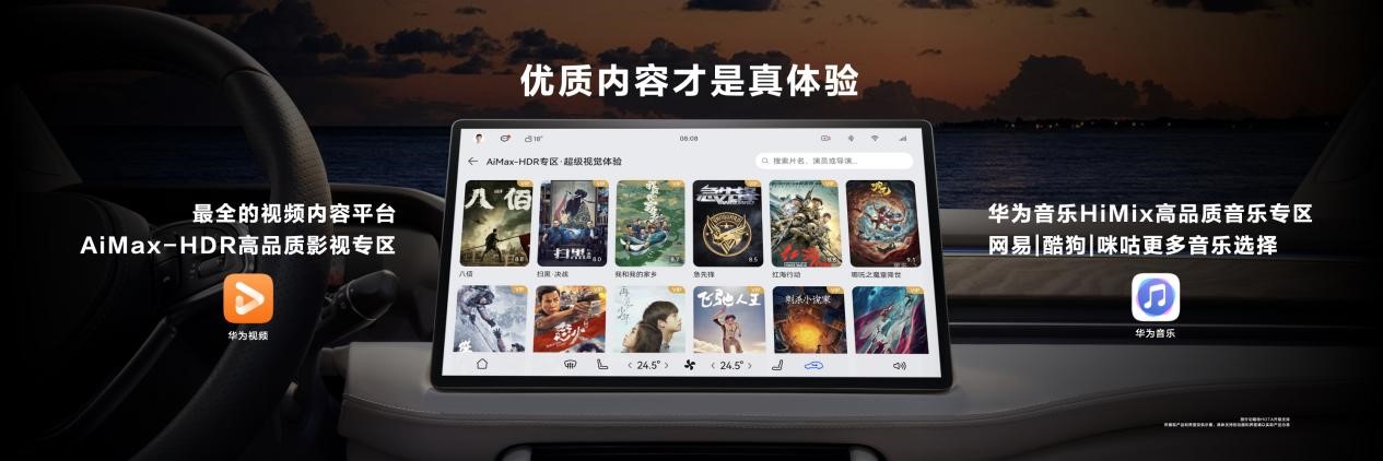 华为视频则与芒果TV等多个平台合作,让用户在车内也可享受到包括好莱坞及国内院线大片、艺术人文、知识教育等特色专区内容在内的海量视频资源,配合车内15.6英寸2K HDR智能中控大屏,带来震撼的临场视听感受。