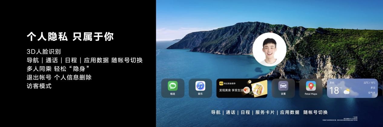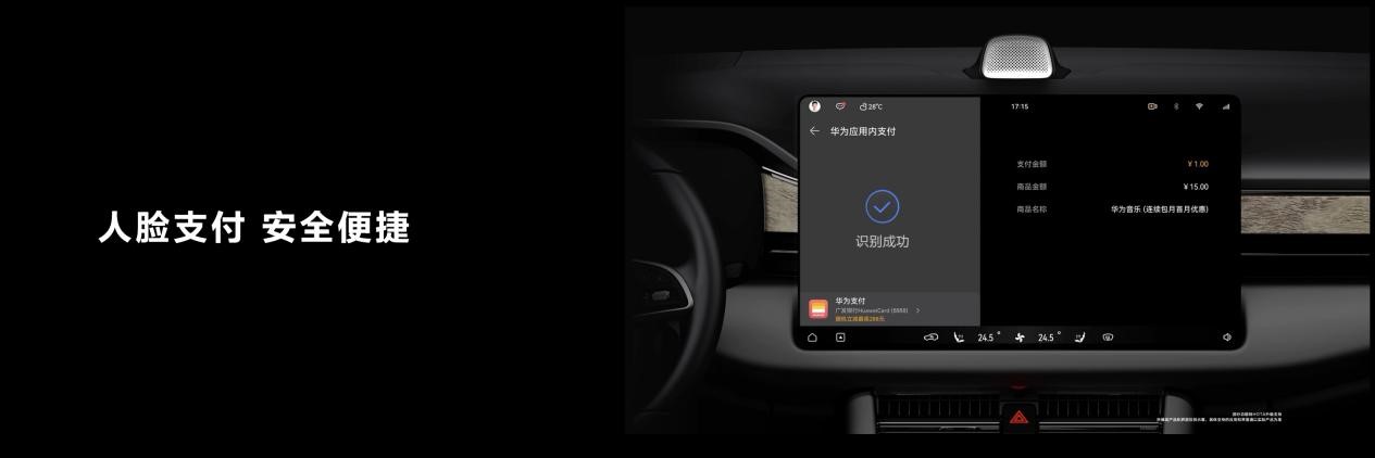 此外,华为也将人脸支付体验带进智能座舱,用户可通过车内摄像头进行人脸识别验证,从而进行支付操作,部分车机应用将率先支持,这也是华为人脸支付首次上车。