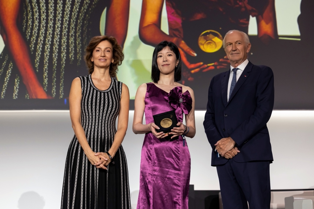 欧莱雅董事会主席、欧莱雅企业基金会主席安巩(Jean-Paul Agon)(右一)、联合国教科文组织总干事奥德丽·阿祖莱(Audrey Azoulay)(左一)为胡海岚(中)颁发2022年“世界杰出女科学家成就奖”