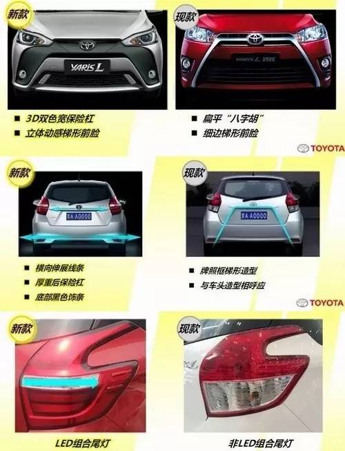 新的广汽丰田致炫即将于8月迎来上市,我们也提前获知了新款车型的所以改款细节,并加以对比分析。首先是车身颜色方面,取消了之前市场选择度并不高的炫彩绿色,取而代之的是新增更为明快的黄绿色。梯形轮廓的前脸被进一步强化,宽幅黑色饰板取代了现有的银色线条装饰,按照丰田的设计理念,这是“X型前脸”和“3D双色宽保险杠”,但是爵爷看到总是会联想到鲶鱼的胡须。