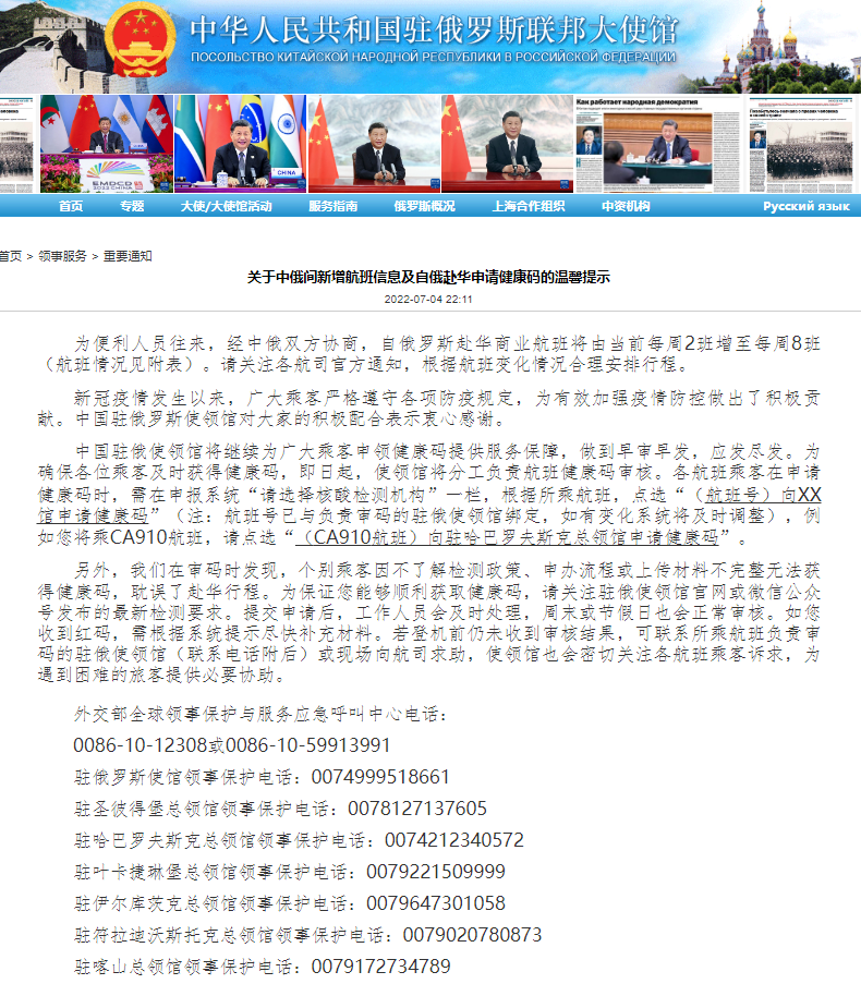 中国驻俄罗斯大使馆:自俄赴华商业航班将由每周2班增至每周8班