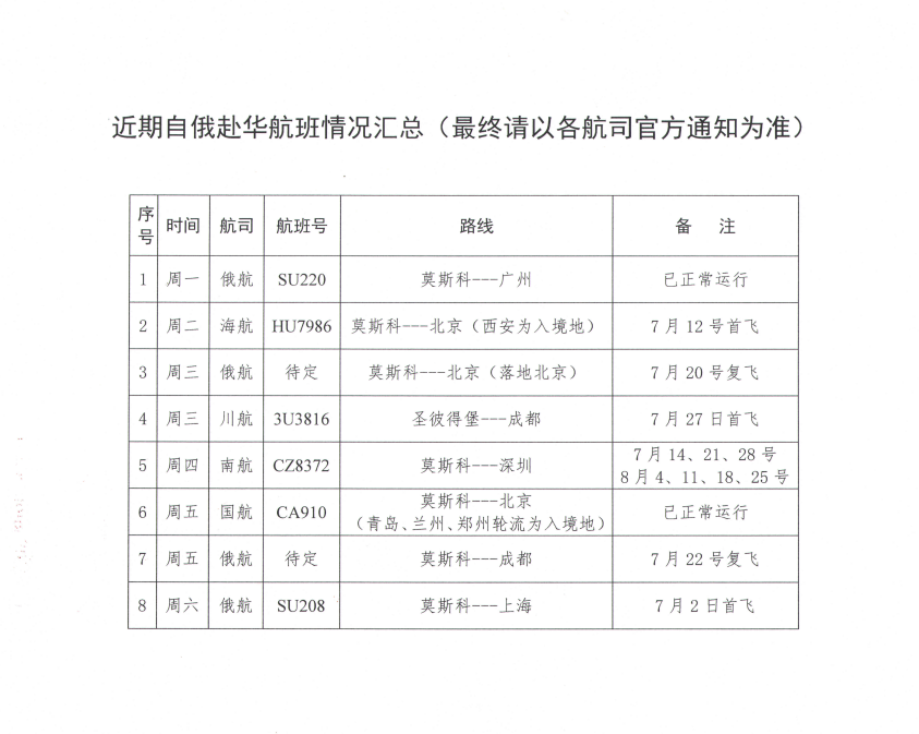 据中国驻俄罗斯大使馆网站7月4日消息,为便利人员往来,经中俄双方协商,自俄罗斯赴华商业航班将由当前每周2班增至每周8班。使馆通知全文及航班细则如下: