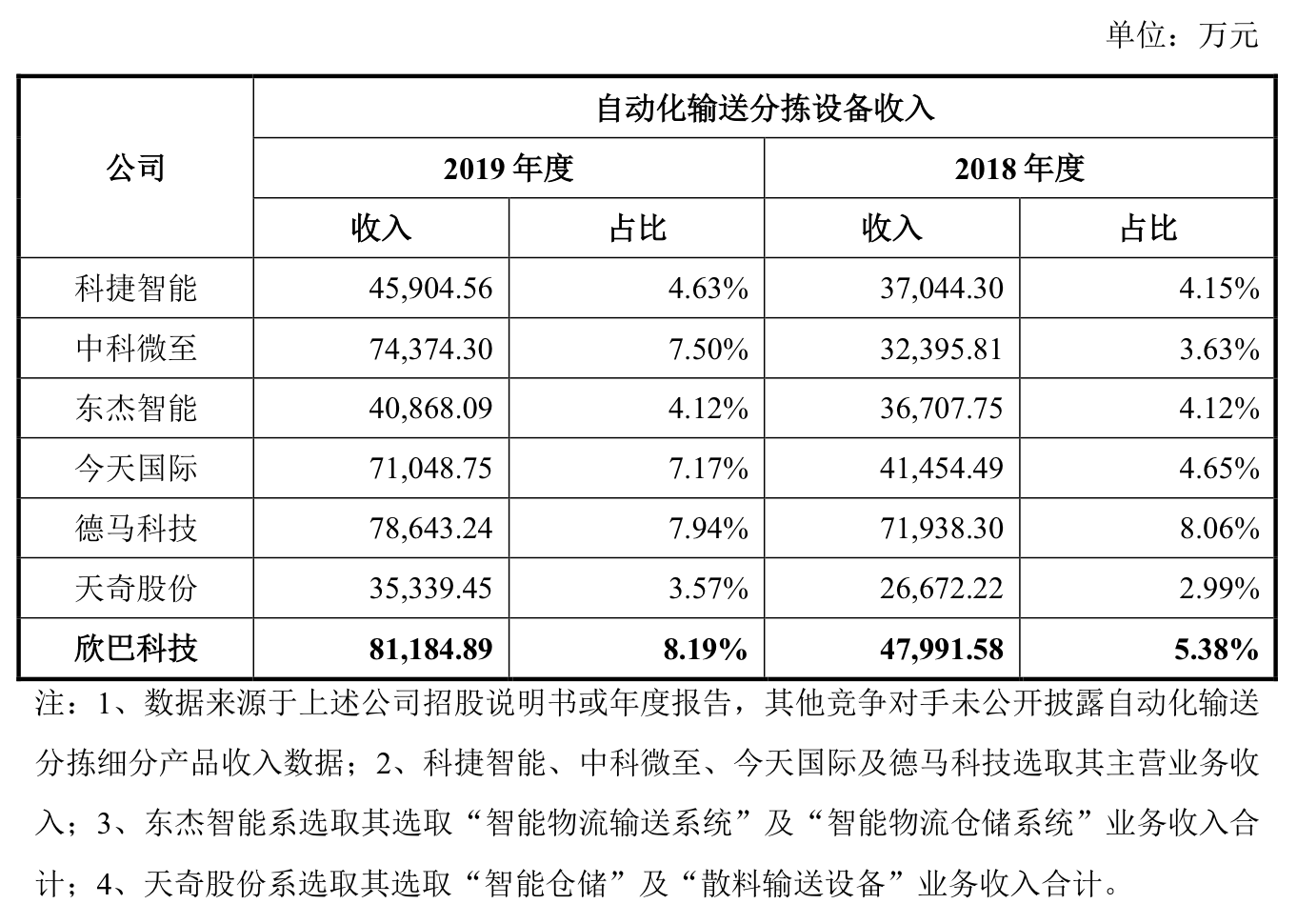 根据欣巴科技的自我评估,公司认为2019年的市场份额为8.19%,高于2018年的5.38%。欣巴科技的主要竞争对手包括中科微至(688211.SH)、东杰智能(300486.SZ)、今天国际(300532.SZ)、德马科技(688360.SH)、兰剑智能(688557.SH)等。